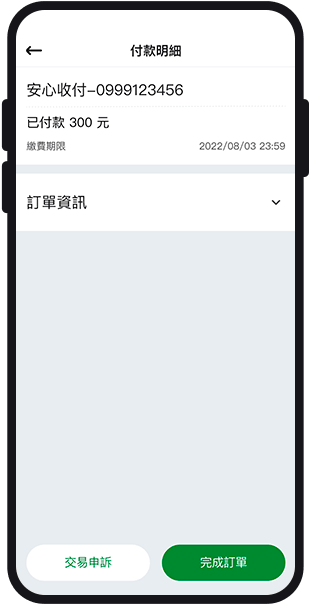 買家收到商品或服務並確認內容無誤後,請至【綠界 Pay 首頁>付款紀錄】點選該筆訂單,並點擊「完成訂單」,即代表交易完成。