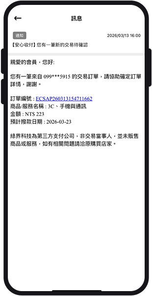 當賣家收到交易訂單待確認推播通知,表示買家已完成訂單繳款,請點選訊息內的該訂單編號進入綠界Pay 查看,並完成出貨。