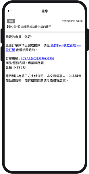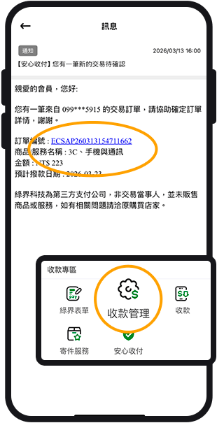 可透過點擊訊息中的訂單編號進入查看;或從綠界Pay > 收款管理 > 一般訂單查看